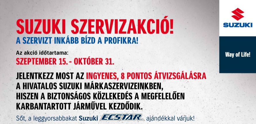 A Suzukinál október 31-ig van meghirdetve az a szervizakció, amelyben egy ingyenes 8 pontos átvizsgáláson esik át a motor.