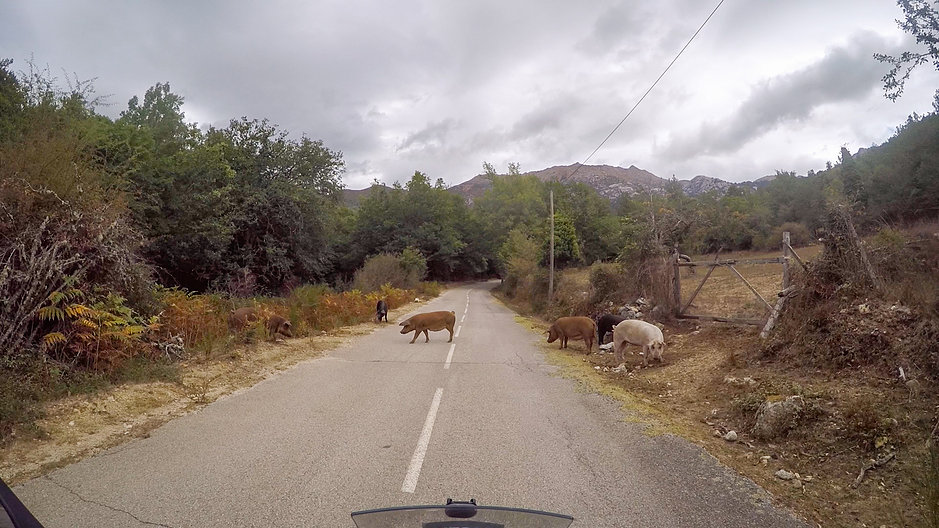 Bocognano felé vettük az irányt, itt szándékoztunk a T20-asra felhajtani. De addig volt részünk pár meglepetésben: malacok az úton, eső a nyakunkba.