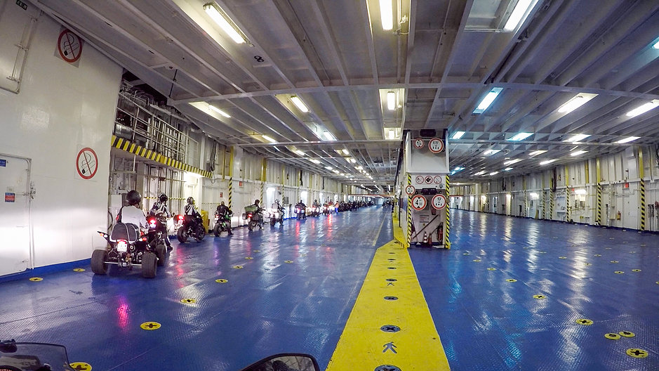 Innen már minden simán ment, becsekkoltunk, megtaláltuk a kompot és felhajtottunk. A motorokat egy emeleti teremben helyezték el, a fal, illetve oszlopok mellé állítottak minket, amihez odakötözték a gépeket. Saját motor esetében érdemes vinni valami rongyot vagy régi törölközőt, hogy a kötél és az ülés közé az kerüljön.